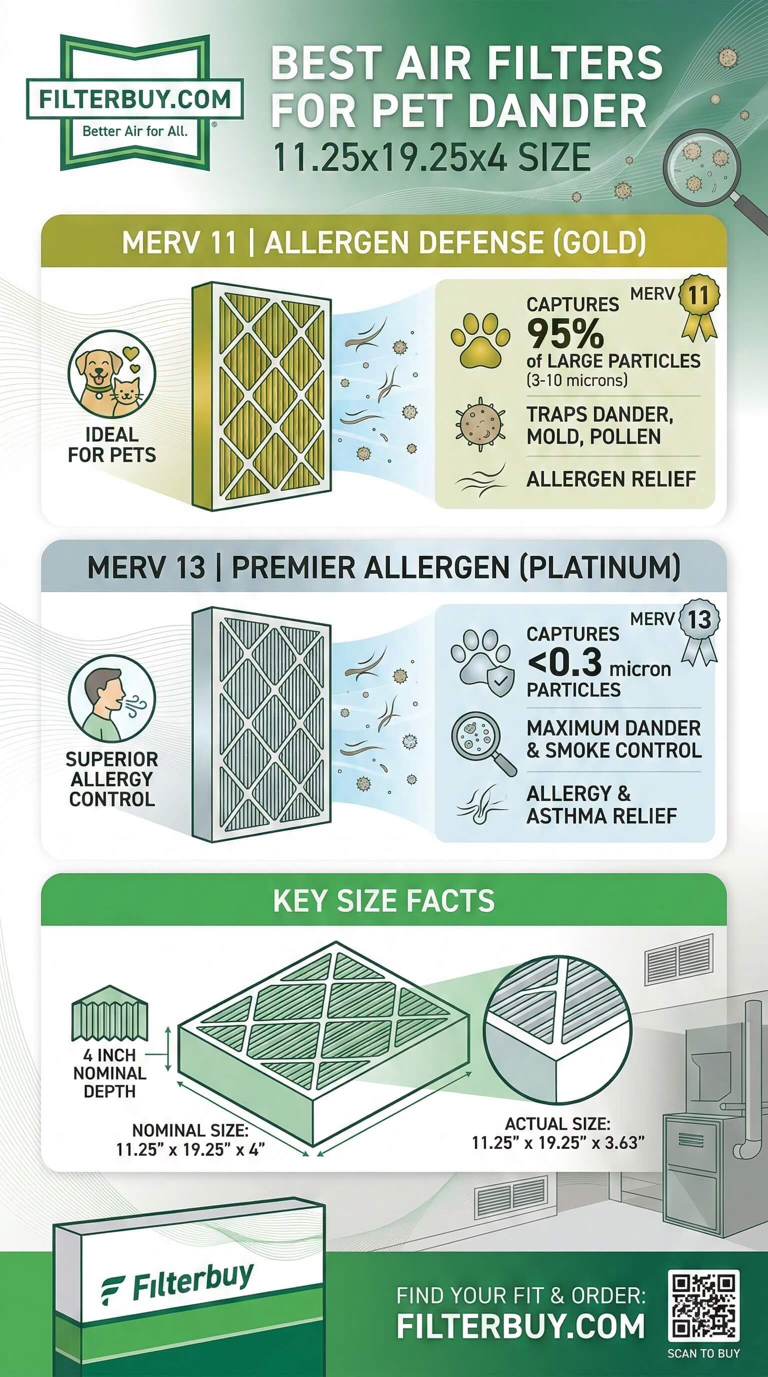 Short answer: For pet households, our MERV 11 (Superior) or MERV 13 (Optimal) 11.25x19.25x4 filter is the right call. Free shipping, factory-direct pricing, and this exact size are always in stock.